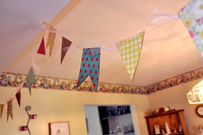 I created the banner using my Cricut and cutting the pieces out of Emma's Shoppe patterned. I inked each of the pieces and then sewed the tops of them together in a banner using my sewing machine and pink thread. Then, I tied pieces of light pink tulle in between the pieces. It was simple, pretty and set the stage for the party.