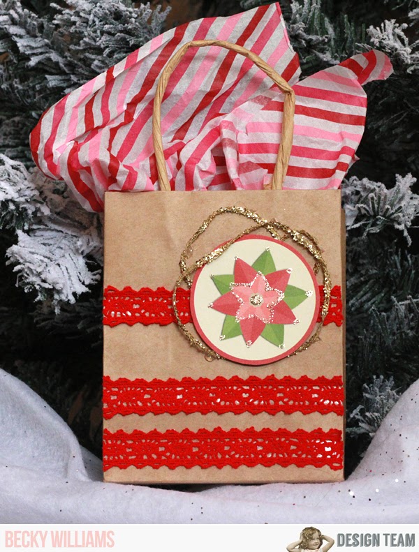 For this bag I cut the poinsettia from a Jillibean Soup card and added some glitter glue and some of the beautiful gold trim from the kit.