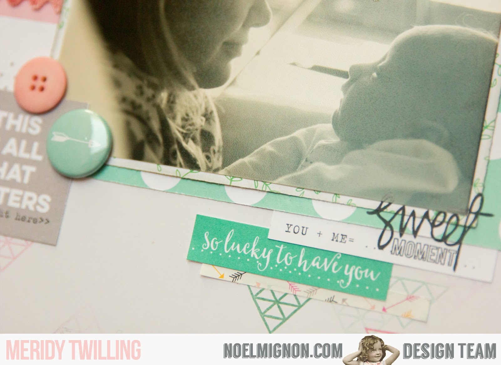 For the title of my layout, I fussy cut around the "love" sentiment on one of the cut apart sheets in the kit and inked the edges. I then cut the "every moment" phrase from the patterned paper that I used, I cut it from part of the paper that would be covered by the photos, mounted it on pop dots, and placed it directly over the "every moment" phrase that was printed on the paper. Next I colored the letters in with the Tim Holtz marker that came in this month's kit. I added the heart charm and the enamel dot from the kit and finished it off with 2 buttons from my stash.