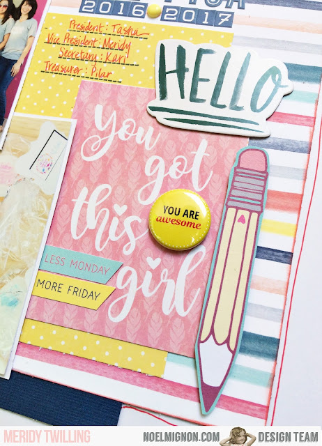 After I choose which papers to use, I began to arrange them on the layout, I used the striped paper as the anchor for my design and built up from there. I used the "Hello" chipboard and the "you got this girl" 3x4 card as sort of a sub title. I also added some flair from a previous kit, and fussy cut the "less Monday" & "more Friday" from a paper in this month's kit.