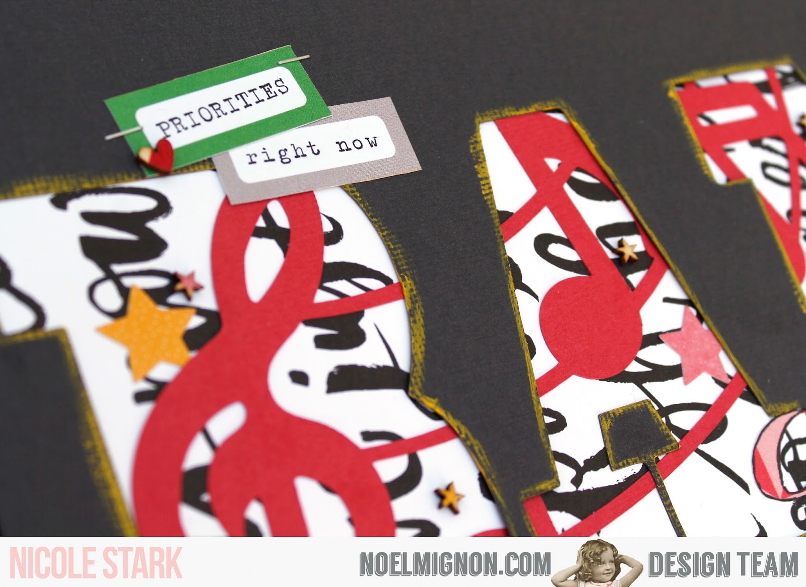 I embellished the title with a yellow chipboard heart and a few enamel dots that I had left over from an older Noel Mignon kit. The color scheme matched perfectly.
