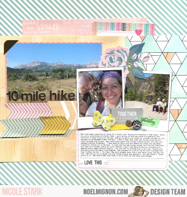 I love the mix of embellishments in this months kit. I used on top of my smaller photos: cork flower, button, tickets, washi tape, and the resin butterfly. I added color to the resin butterfly with gelatos. I rubbed placed a bit of color on and then rubbed it into the resin. I finished by adding journaling to one of the Project Life cards and stapled the "Love This" to the bottom corner.